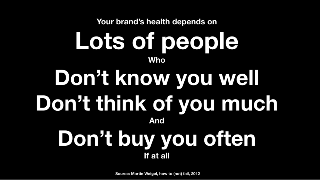 Mental availability encompasses awareness, but is really a composite of spontaneous awareness, salience, distinctiveness, associations with category cues, being noticed and remembered. It rules over everything. People being aware of your brand obviously isn’t enough; people remembering it for relevant things at critical decision-making moments is what you need.