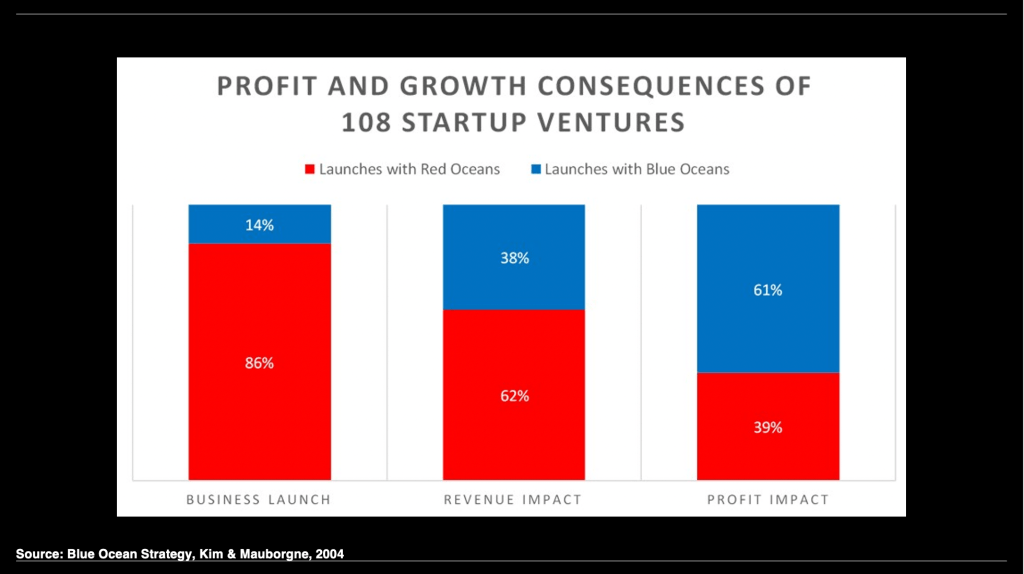 Operating in uncontested market space is far more profitable than competing for a share of an existing market. A study of 108 business launches from 2004[2] showed that the 14% competing in uncontested market space (‘Blue Oceans’), achieved 38% of the total revenue impact and 61% of the total profit impact. Whilst the majority of 86% business launches were competing in existing markets (‘Red Oceans’), only achieved 39% of the total profit impact.