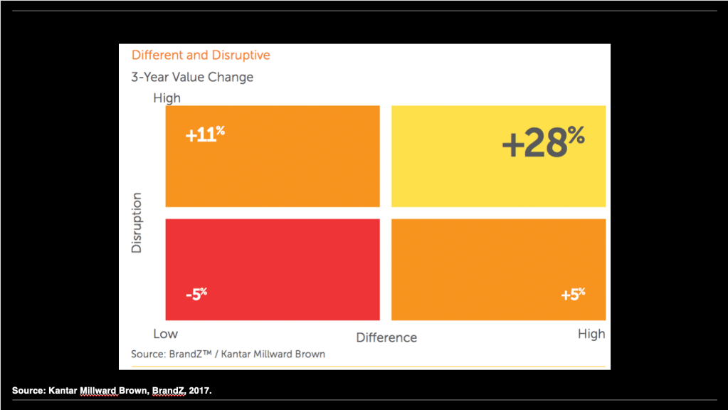 Over a three-year period from 2015-2017 brands that were perceived to be both highly disruptive and different increased in brand value by 28%, whereas brands that were perceived as both low in disruption and differentiation declined by -5%[3].