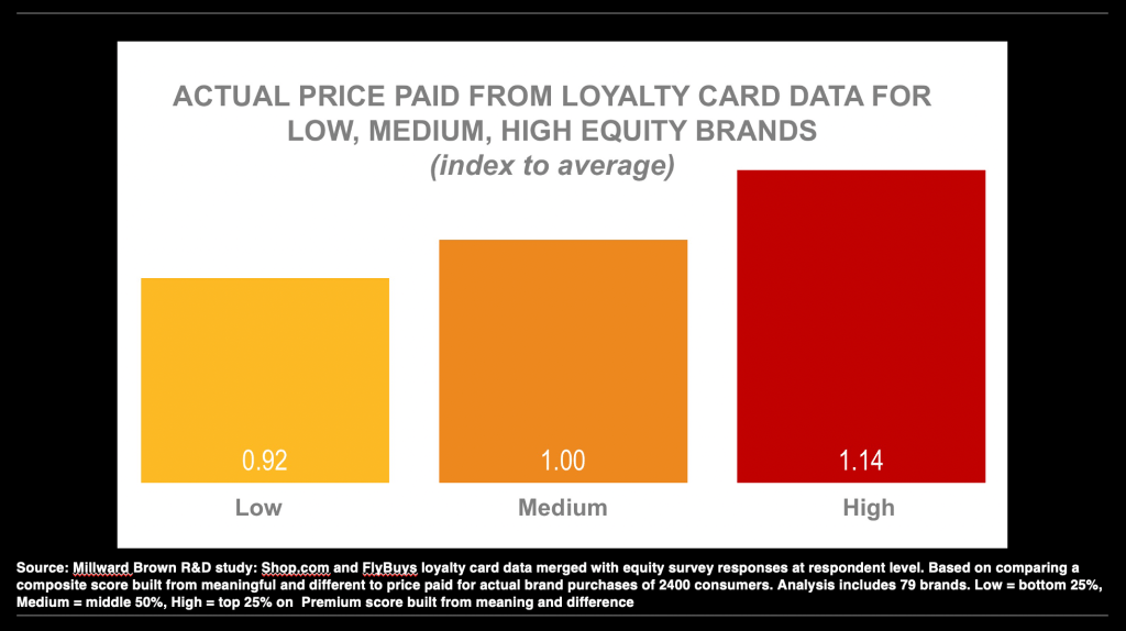 An analysis of actual prices paid (from the loyalty card data of 2400 shoppers for 79 brands) showed that shoppers paid 22% more for brands they find different and meaningful vs those they didn’t, with difference alone accounting for 40% of this on average[5].