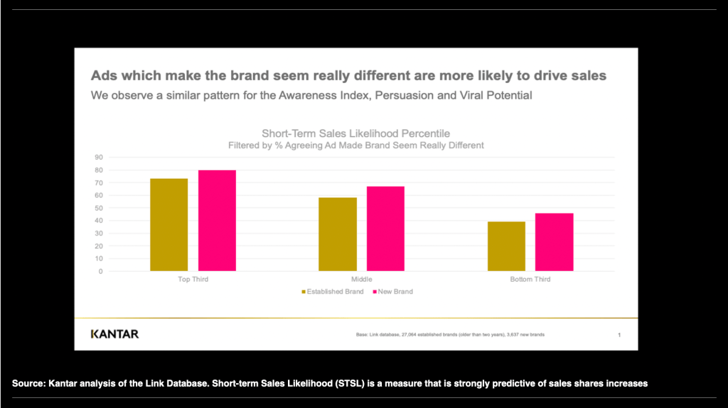 The top 1/3 ads for ‘make the brand seem really different’ in Kantar’s Link database achieve +90% vs the bottom 1/3 on Kantar’s measure of an ad’s likelihood to drive short-term sales[6].