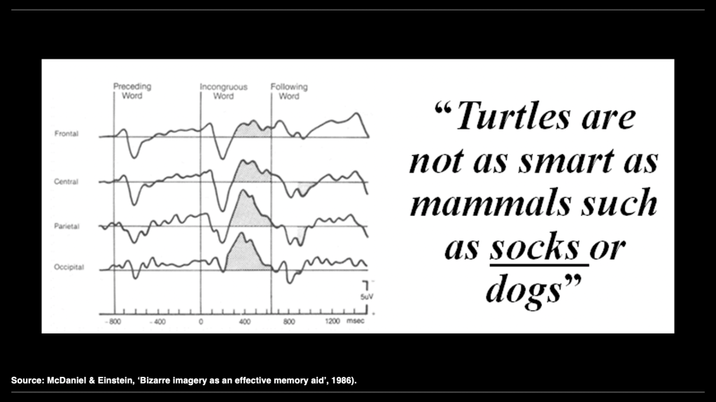 Similarly, ‘The Bizarreness Effect’ predicts that incongruent or surprising things are more memorable than expected and common ones as they’re more distinctive. Researchers from the University of California[8] measured the brain activity of respondents, who whilst wearing EEG caps, read a series of sentences of which some contained semantically incongruous words like “Turtles are not as smart as mammals like socks or dogs.” The data showed a large spike in brain activity when participants read the incongruous word in the sentence, suggesting these words resulted in a significant degree of involuntary attention and processing.