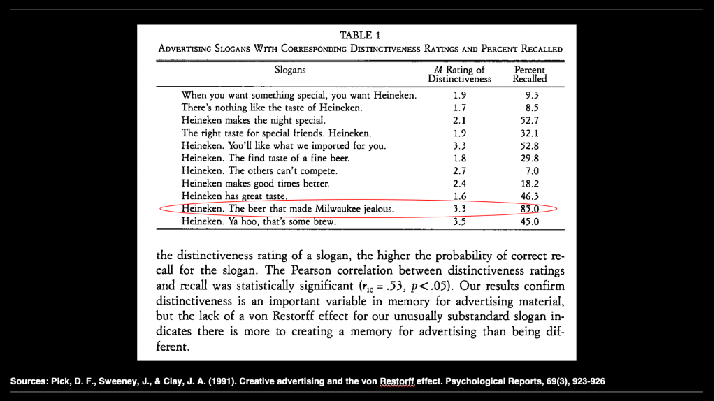 Research into the von Restorff effect in creative advertising found that highly distinctive ad slogans are much more likely to be recalled, but only if they’re judged to be high quality and not if they’re substandard. The slogan ‘The beer that made Milwaukee jealous’ was remembered by 85% in the study but the marginally more distinctive but substandard slogan, ‘Ya hoo, that’s some brew’, was only remembered by 45%.[9]
