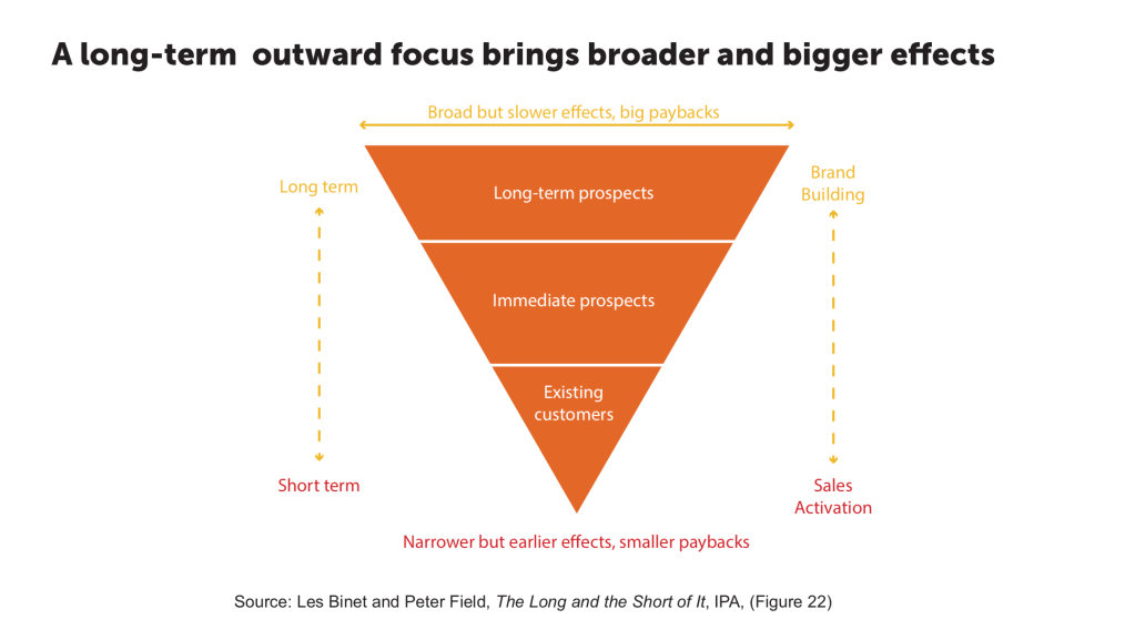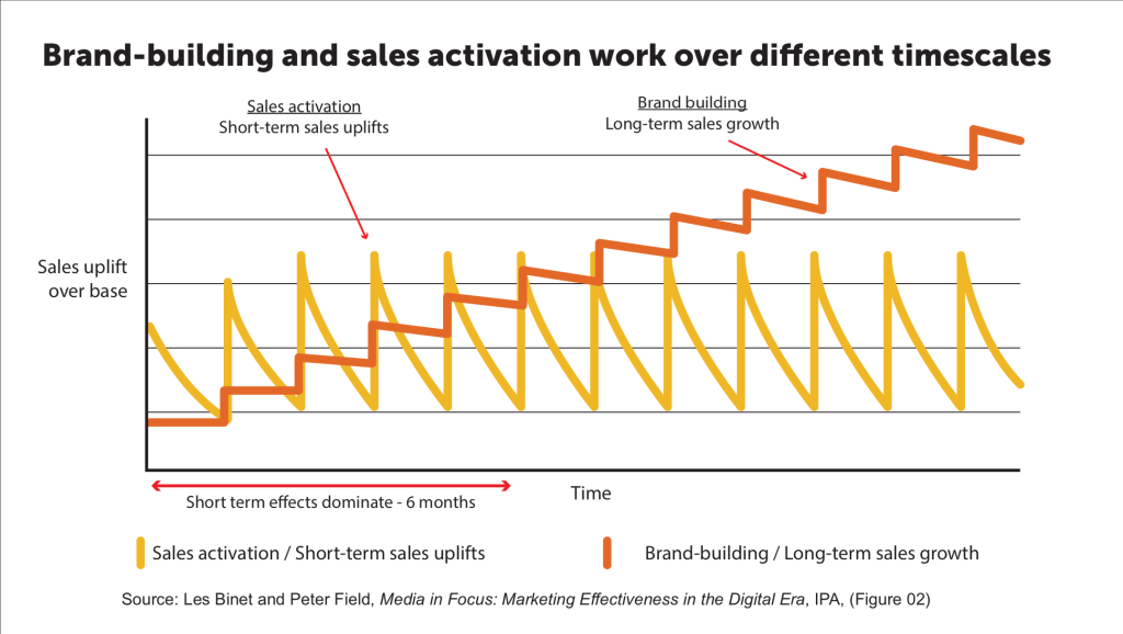 Brand-building activity drives much stronger sales growth over periods of 6+ months than the temporary uplifts driven from by short-term sales activation[9]. Brand-building activity leads to long-term improvements in base sales that short-term sales activity cannot.