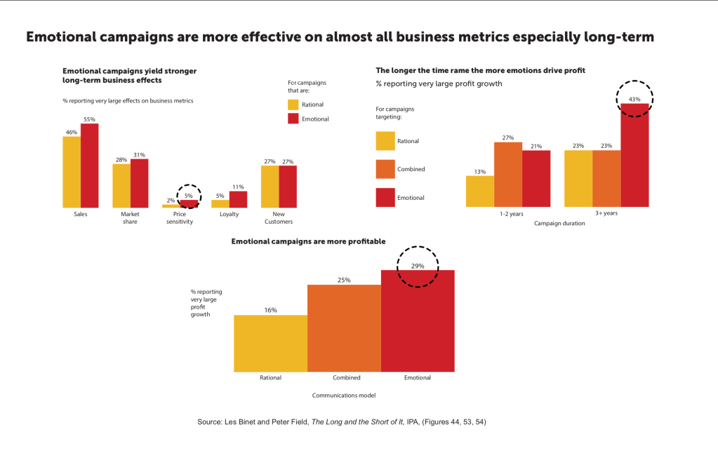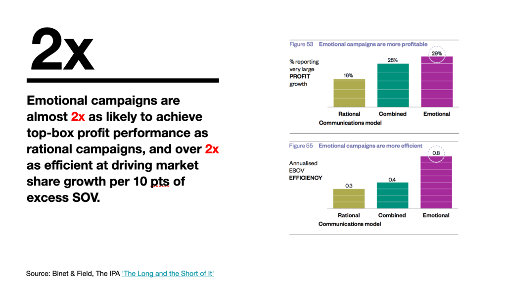 According to Binet & Field’s work, emotional campaigns are twice as likely to be profitable as rational campaigns, more than twice as efficient at driving market share, and work especially well over the long-term[4].
