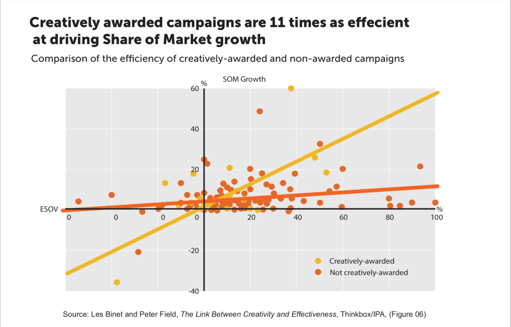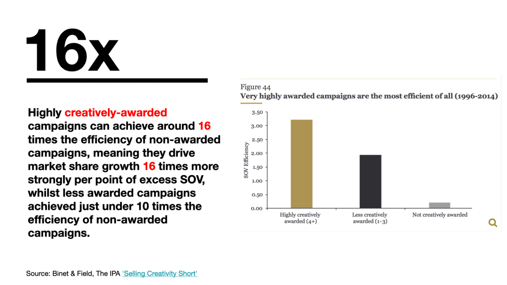 Creative awards aren’t important. But Binet & Field’s work suggests that highly-awarded creative work is dramatically more efficient at driving market share growth than non-awarded work[7]. It’s more likely to get talked about, be remembered and most importantly, deliver a much stronger commercial impact.