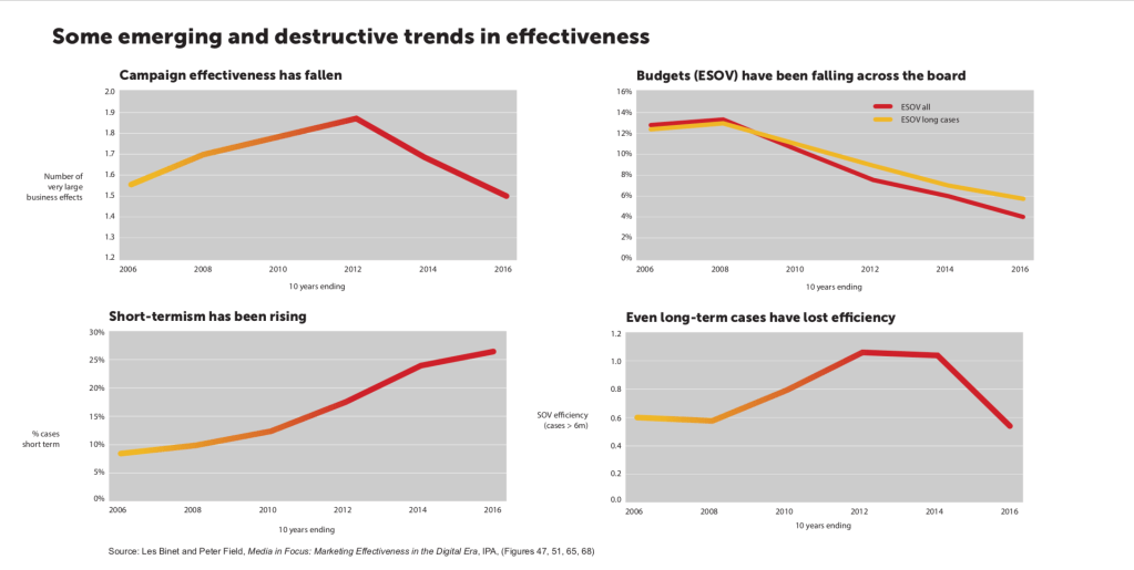 For people who care about advertising effectiveness, doing our jobs without their work is inconceivable. They have provided so much evidence of so many fundamentals: the strong relationship between share of voice and share of market, the causal link between levels of creativity and advertising’s effectiveness, the need to balance long-term brand-building with short-term sales activation, the exceptional commercial impact of emotional and fame-driving communications, to name just a few.