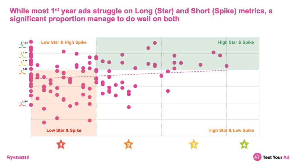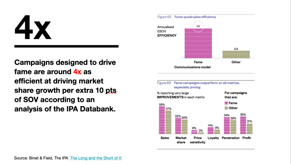 Fame-driving campaigns are 4x as efficient as the average campaign, driving 4x the market share growth per 10 points of extra SOV[5]. Fame is a magic ingredient that can massively enhance the performance of your campaigns.