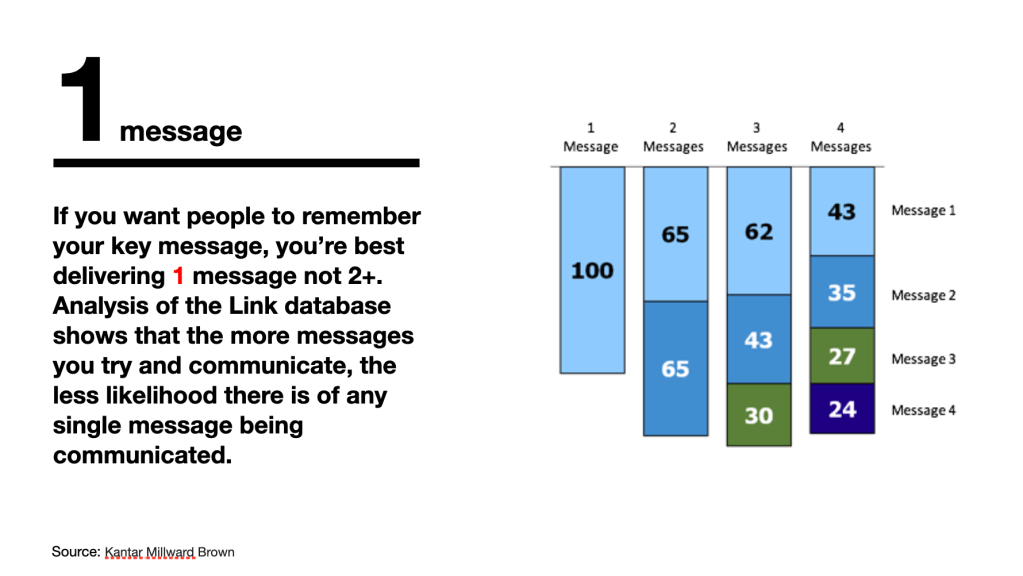 An analysis by Millward Brown of their Link test database[3] provides evidence of something advertising people have always known instinctively: the more messages you try and communicate, the less likelihood there is of any single message being communicated (‘throw people one tennis ball and they’ll catch it, throw them lots and they’ll drop them all’). And remember this is from people who are being forced to watch your ads in pre-testing research: real people in the real world will remember even less.