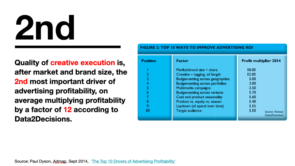Market and brand size are together the biggest driver of advertising profitability, but the 2nd biggest factor is the quality of creative execution[6]. In fact it can impact ROI by a factor of 12. Creative execution is not ‘colouring in’: it matters more than nearly everything else.