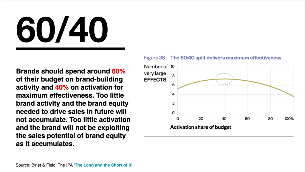 The optimum split in investment between brand-building and sales activation is on average 60% brand-building, 40% activation[10]. Invest less than 60% in brand activity and the brand equity required to generate future sales will not accumulate.