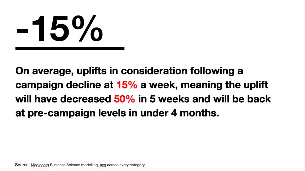 10. Once you’re seeing an impact on brand consideration, you’ve got to keep going as it will drop 15% per week on average following a campaign.