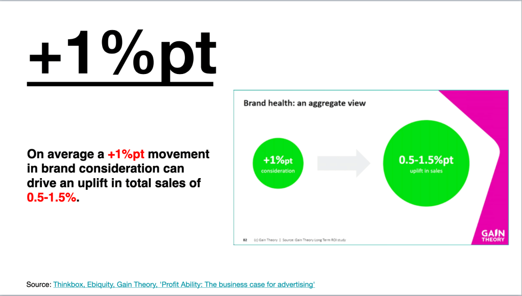 According to Gain Theory, on average a +1% change in brand health (specifically brand consideration) can drive an uplift of 0.5-1.5% total annual sales[7].