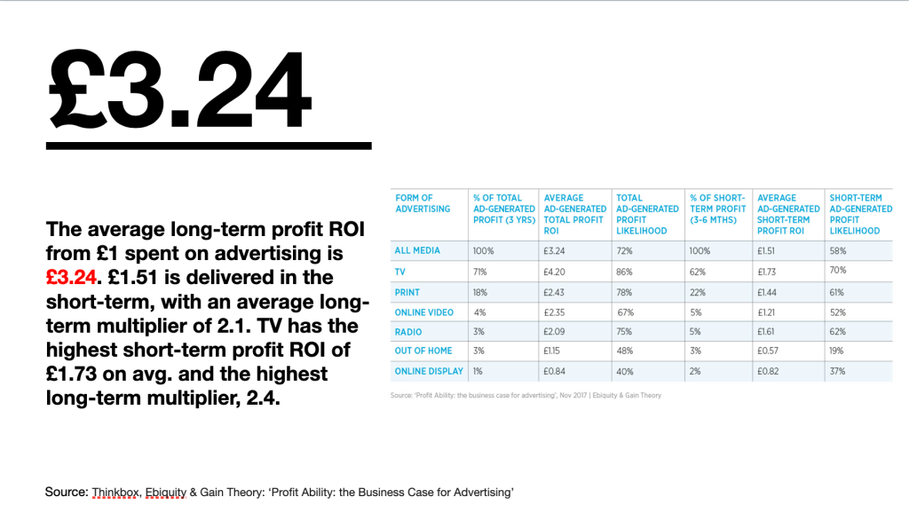 The average UK advertising campaign delivers £1.51 of short-term profit and £3.24 in long-term profit for every £1 spent, according to Thinkbox’s latest study of 1954 campaigns across 150 advertisers[12]. And the strongest short-term profit ROI recorded for a single campaign in this analysis was a massive £12.96.